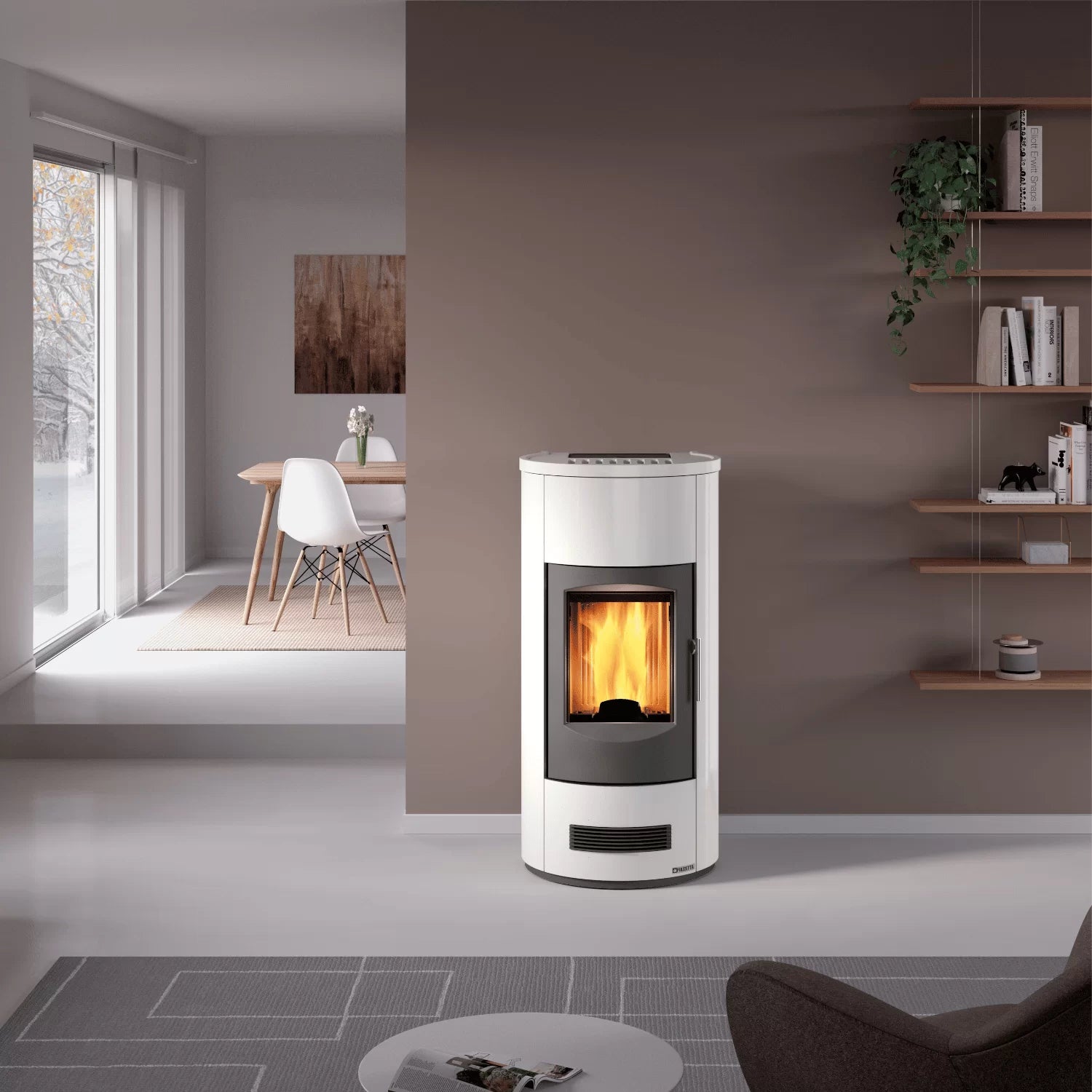 Poêle aux granules avec revêtement en acier et plateau supérieur en Faïence. Commandes simplifiées avec panneau numérique. Disponibilité de la fonction Natural Mode, qui permet d’utiliser également la convection naturelle pour chauffer la pièce. Une âme double dans le même poêle: efficacité et rapidité de chauffe, silence et confort.